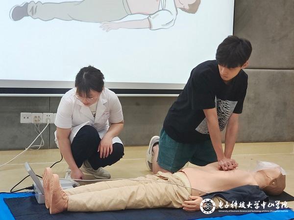 活动现场,医务所的刘涛医生结合真实的案例和多媒体课件为学生们讲解了急救基本常识、急救的意义、黄金救援时间等。接着,借助模拟设备,两位医生讲解了气管异物处置的方法——海姆利克急救法,其中包括背部叩击、腹部冲击等技巧。通过模拟操作,同学们掌握了正确的气道梗阻急救技巧,提高了在紧急情况下解除梗阻的能力。最后,两位医生结合模型为大家详细讲解了心肺复苏(CPR)的按压方法、按压部位、按压频率以及AED(自动体外除颤器)的使用方法。讲解结束后,同学们都进行了模拟操作,掌握了正确的CPR技能。