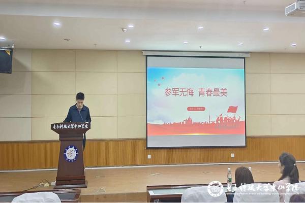 蔡敏健同学因为从小对军警类的职业有着强烈憧憬,毅然决定参军入伍。在他的分享中,两年的军旅生活是高强度,但又丰富多彩的。在桂林,他参与了真枪实弹的训练,投掷手榴弹的训练环节他至今历历在目。在演讲的最后,他用“参军无悔,青春最美!”号召同学们积极加入应征入伍的队列。